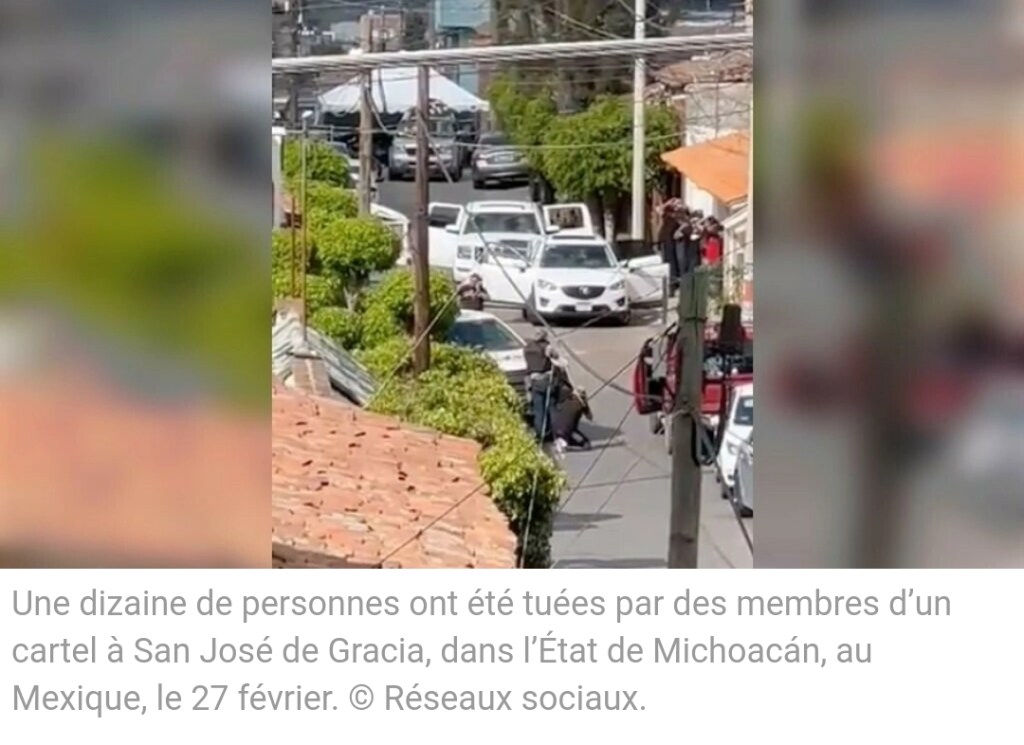 Dans une vidéo tournée le 27 février, dans la ville de San José de Gracia, dans l’État de Michoacán, on voit un groupe de personnes, le long d’un mur, dans la rue, les mains sur la tête. Des hommes armés leur font face. Un autre homme est au téléphone. Puis on entend un tir. À ce moment-là, l’homme au téléphone semble tomber au sol et le cadre de l’image bouge vers la gauche : il devient alors impossible de voir ce qu’il se passe, mais on entend une rafale de tirs durant dix secondes environ. À la fin de la vidéo, de la fumée est visible à l’endroit où se trouvait le groupe de personnes.