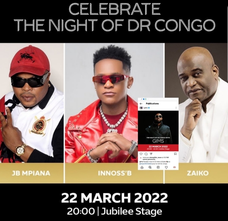 Les stars congolaises de la chanson vont prester le mardi 22 mars 2022 à la nuit de la RDC à l’Expo Dubai 2022 aux Emirats Arabes Unis. Les musiciens attendus sont : Gims, JB Mpiana, Jossart Nyoka Longo et Innos’B.