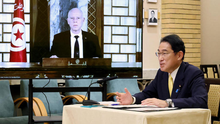 ![Le Premier ministre japonais Fumio Kishida en visioconférence avec le président tunisien Kais Saied. [AFP PHOTO / CABINET PUBLIC AFFAIRS OFFICE OF JAPAN VIA JIJI PRESS]](https://static.cnews.fr/sites/default/files/styles/image_750_422/public/000_32h629p_630b7e0263b70_0.jpg?itok=yN11zmvC)