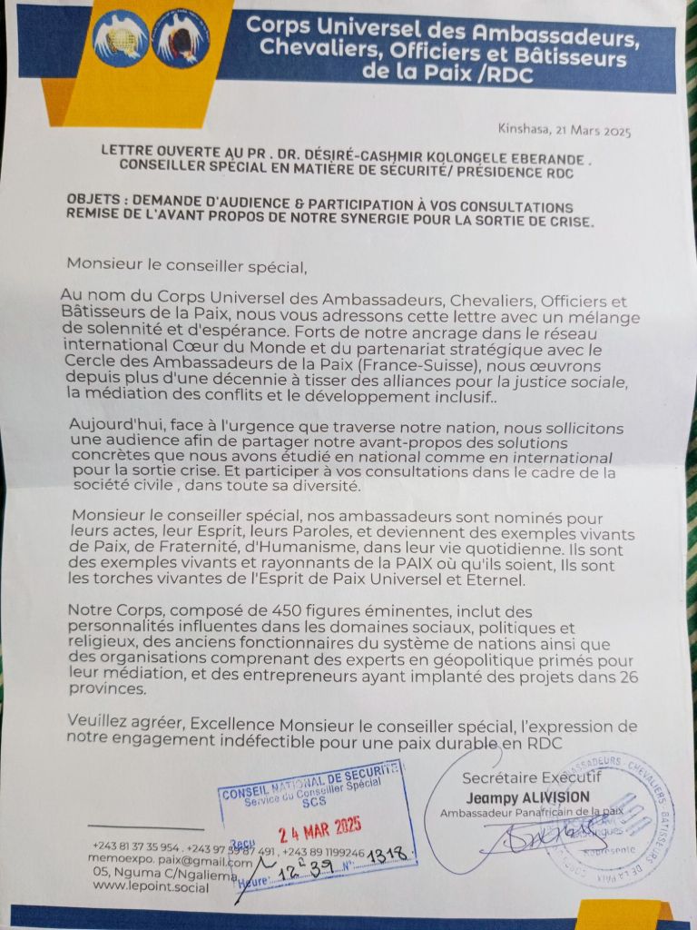 Le Corps Universel des Ambassadeurs, Chevaliers, Officiers et Bâtisseurs de la Paix s’impose comme une plateforme incontournable dans la quête de solutions durables aux crises qui secouent la République Démocratique du Congo. Fort de près de 500 figures éminentes, incluant des experts en géopolitique primés et des entrepreneurs ayant implanté des projets dans les 26 provinces de la RDC, cette structure internationale appelle à une consultation directe avec le conseiller spécial en matière de sécurité du président Félix Tshisekedi.