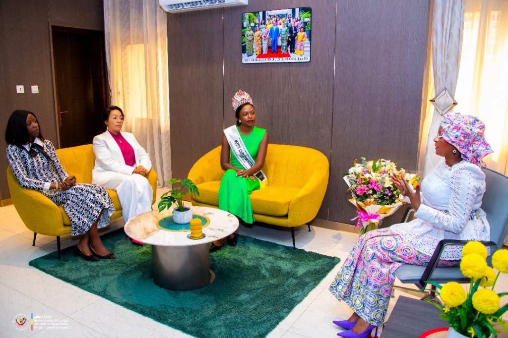 La ministre des Affaires sociales, Actions humanitaires et Solidarité nationale, Madame Nathalie-Aziza MUNANA, a reçu en audience ce mardi 9 juillet 2025, Miss Indépendance 2025, Mademoiselle Kezi Mutumayi, accompagnée de Madame Véronique Kashala, initiatrice du concours Miss Indépendance RDC.