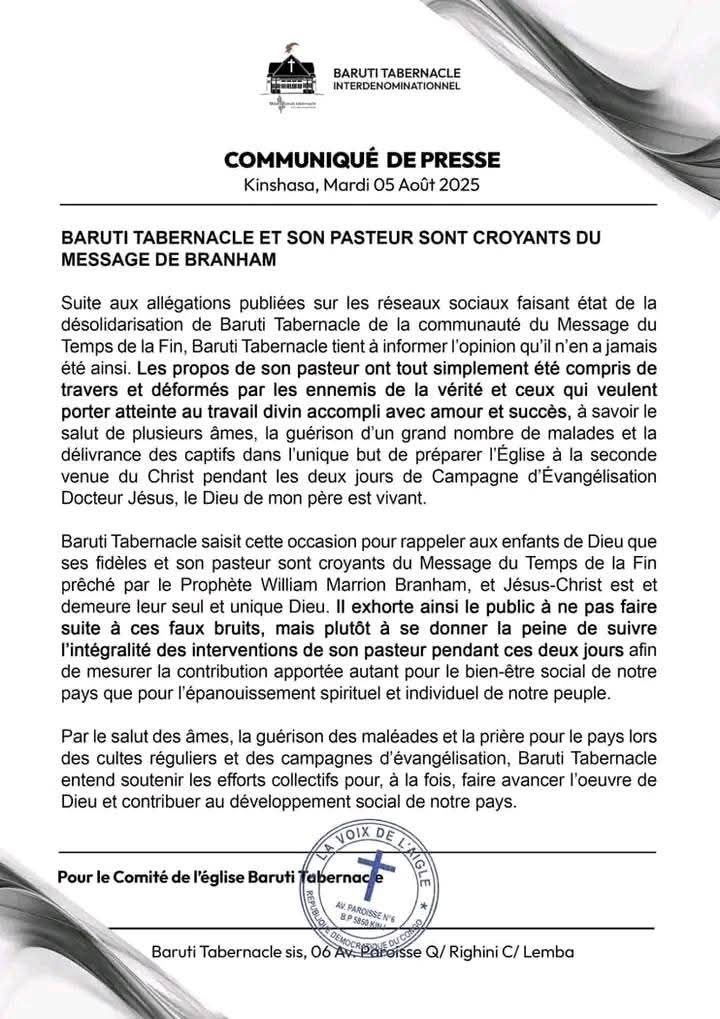Dans une déclaration officielle, Baruti Tabernacle a rejeté catégoriquement ces allégations, précisant qu’« il n’en a jamais été ainsi ». Selon l’église, les propos de son pasteur auraient été « mal interprétés et volontairement déformés par des ennemis de la vérité et des personnes mal intentionnées qui cherchent à discréditer l’œuvre divine accomplie au sein de l’assemblée ».
